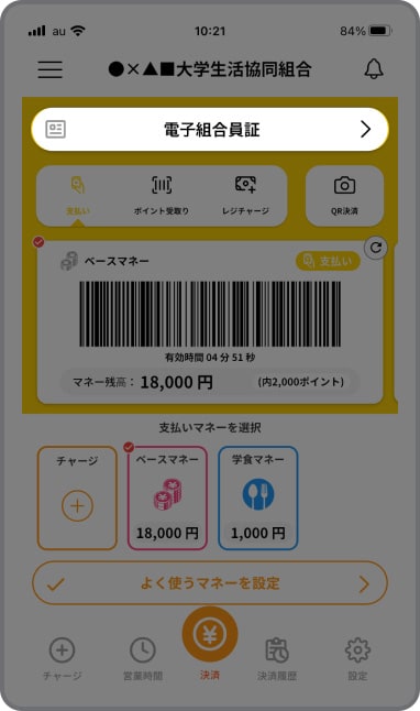 組合員は大学生協アプリを登録することで生協電子マネーを利用することができます。